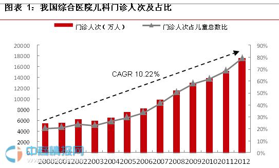 兒科門診人次及占比逐年提高,體現(xiàn)了旺盛的醫(yī)療需求。從2000年至2012年,我國綜合醫(yī)院兒科門診人次翻了3倍多,達到1.76億人次,CAGR為10.22%,門診人次占兒童總數(shù)的比重從20.47%上升為79.00%。