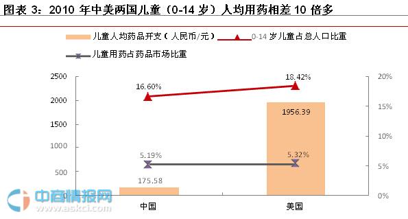 橫向比較,中國兒童人均藥品消費金額不到美國的1/10,蘊含巨大潛力。2010年美國藥品市場規(guī)模3100億美元,其中兒童(0-14歲)藥165億美元,占5.32%。2010年我國藥品市場規(guī)模7556億元,其中兒童藥392億元,占5.19%。2010年,中國和美國兒童人均用藥金額分別為176元和1956元,十倍多的差距顯示中國兒童用藥市場巨大的潛力。