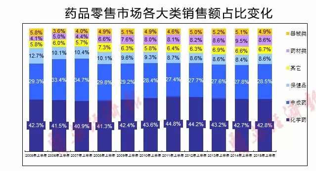 根據(jù)CFDA南方所廣州標點醫(yī)藥信息有限公司中國藥品零售系統(tǒng)監(jiān)測數(shù)據(jù)顯示,2015年上半年藥品零售市場化學藥、中成藥和保健品的銷售額占比分別為42.8%、28.5%和8.6%,化學藥銷售額占比與2014年同期相比上升0.1個百分點,中成藥上升0.7個百分點,保健品上升0.2個百分點,藥材類下降0.9個百分點,器械類下降0.2個百分點。從藥品零售市場各大類銷售額占比變化圖上看到,藥材類銷售額占比下滑較為明顯,中成藥類產品有所提升。