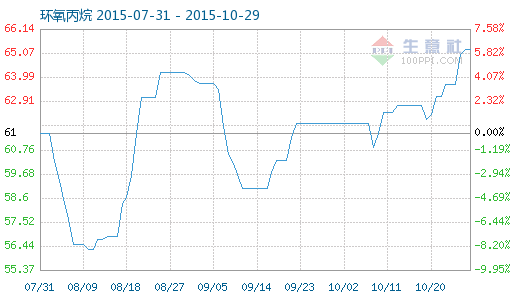 10月28日環(huán)氧丙烷商品指數(shù)為65.25,與昨日持平,較周期內(nèi)最高點101.18點(2011-10-26)下降了35.51%,較2015年08月11日最低點56.27點上漲了15.96%。(注:周期指2011-09-01至今)