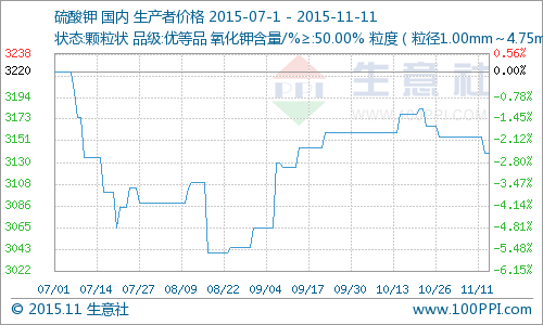 11月11日硫酸鉀商品指數(shù)為82.82,與昨日持平,較周期內(nèi)最高點(diǎn)100.26點(diǎn)(2012-05-01)下降了17.39%,較2015年08月23日最低點(diǎn)80.21點(diǎn)上漲了3.25%。