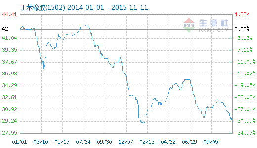 11月10日丁苯橡膠(1502)商品指數(shù)為29.38,較昨日下降了0.18點(diǎn),較周期內(nèi)最高點(diǎn)103.60點(diǎn)(2011-09-08)下降了71.64%,較2015年02月03日最低點(diǎn)28.96點(diǎn)上漲了1.45%。