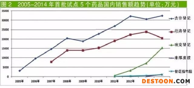 據(jù)國內(nèi)樣本醫(yī)院數(shù)據(jù)統(tǒng)計,國內(nèi)替尼類用藥市場規(guī)模從2005年的5339萬元增長到2014年的14.9億元,2014年同比增長38.2%。國內(nèi)替尼類藥物自上市以來一直保持較高的增長速度,2005-2014年復(fù)合增長率高達44.7%,9年整體市場增長27.8倍。