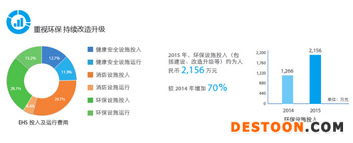 在EHS方面,重視環(huán)保,持續(xù)升級改造,2015年環(huán)保設(shè)施投入2156萬元,較2014 年增加70%;更有效利用水資源,總循環(huán)用水量為2014年的6.38 倍;職業(yè)健康安全硬件投入與運營總費用4505萬元,是2014年的2倍,同時EHS培訓(xùn)總時長超過7萬小時。