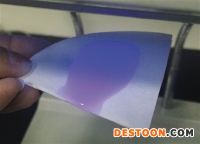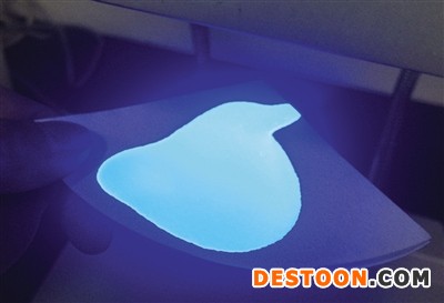 紫外儀下,奧妙洗衣液樣品發(fā)出明顯的藍(lán)色亮光。