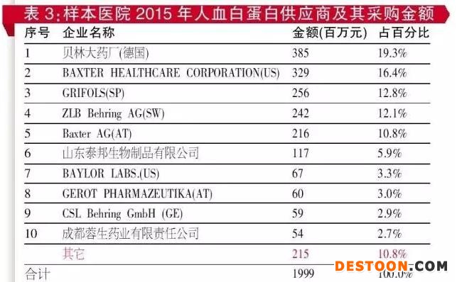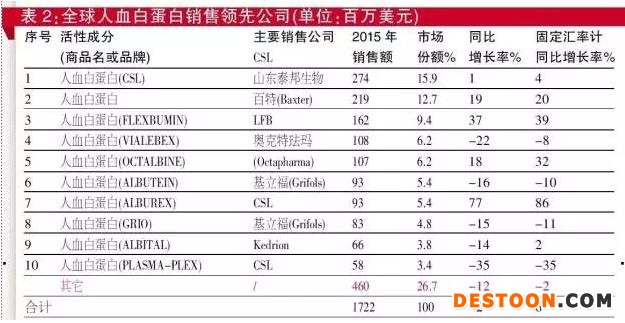 據(jù)統(tǒng)計(jì),2014年10月至2015年9月,按制劑出廠金額計(jì),全球人血白蛋白市場規(guī)模約為17億美元,中國人血白蛋白市場規(guī)模為5.7億美元,同比增長12%,是全球人血白蛋白市場規(guī)模最大的國家;美國居第二位,達(dá)2.7億美元,同比增長6%。全球人血白蛋白銷售領(lǐng)先公司見表2??上驳氖牵綎|泰邦生物制品有限公司在全球人血白蛋白銷售領(lǐng)先公司之列,并居第二位。