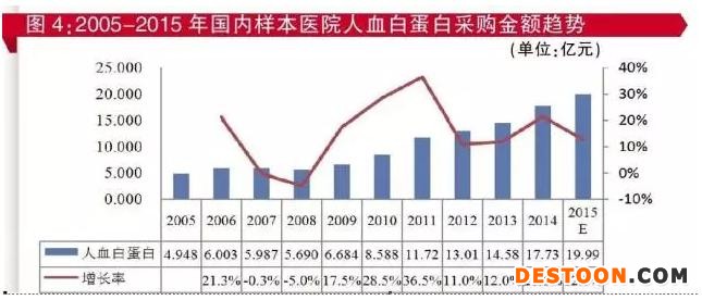 據(jù)PDB數(shù)據(jù),預(yù)計(jì)2015年樣本醫(yī)院人血白蛋白采購金額合計(jì)約為20億元,占血液制品采購金額的57%,比例日趨合理(2005年占比為66.4%)。從樣本醫(yī)院2005-2015年人血白蛋白采購金額趨勢圖中看出(見圖4),2012-2015年3年間樣本醫(yī)院人血白蛋白采購金額年復(fù)合增長率為15.4%。