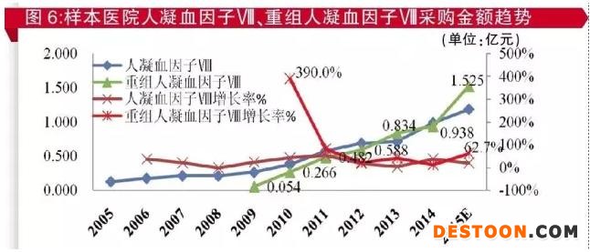 2005-2015年,樣本醫(yī)院人凝血因子Ⅷ和重組人凝血因子Ⅷ采購金額趨勢圖顯示(見圖6),2012-2015年3年間樣本醫(yī)院人凝血因子Ⅷ和重組人凝血因子Ⅷ采購金額年復(fù)合增長率分別為19.9%和37.4%。