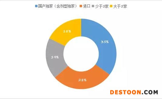 筆者粗略統(tǒng)計(jì)了一下該城市2015年全部醫(yī)保、基藥產(chǎn)品的銷售情況,按照進(jìn)口、國產(chǎn)獨(dú)家、國產(chǎn)少廠家、及普藥等不同類型藥物的銷售比例如下圖。