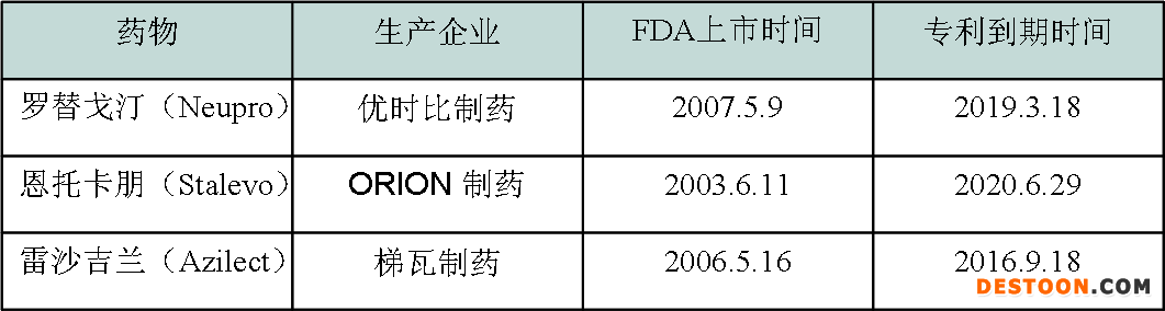 近幾年,帕金森病藥物市場(chǎng)治療藥物品種更新較少,主要有: