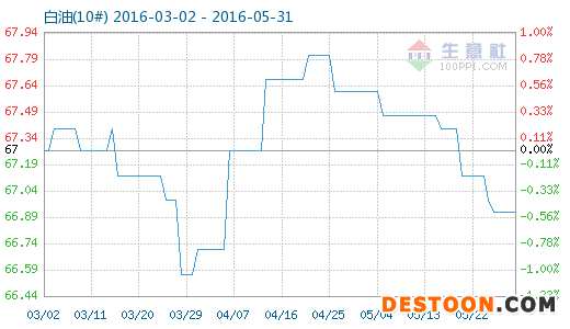 5月30日白油(10#)商品指數(shù)為66.92,與昨日持平,較周期內(nèi)最高點(diǎn)100.00點(diǎn)(2013-12-01)下降了33.08%,較2016年03月30日最低點(diǎn)66.57點(diǎn)上漲了0.53%。(注:周期指2013-12-01至今)