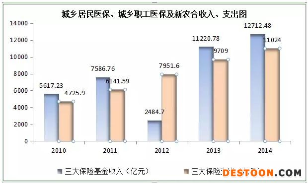 支出分別達(dá)到6697億元、1437億元和2890億元;合計(jì)支出11024億元,比2010年(4726億元)增長(zhǎng)了133.3%,支出增幅比收入高7個(gè)百分點(diǎn)左右;三大保險(xiǎn)制度總支出占全國(guó)醫(yī)療機(jī)構(gòu)業(yè)務(wù)收入的比例達(dá)到了52.4%,醫(yī)保制度已經(jīng)成為醫(yī)療服務(wù)市場(chǎng)最重要的購(gòu)買方。