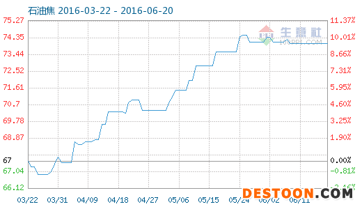6月19日石油焦商品指數(shù)為74.04,與昨日持平,較周期內(nèi)最高點(diǎn)108.79點(diǎn)(2013-04-15)下降了31.94%,較2016年03月28日最低點(diǎn)66.89點(diǎn)上漲了10.69%。(注:周期指2012-09-30至今)