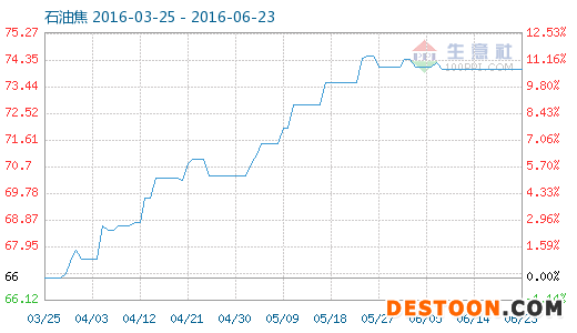 6月23日石油焦商品指數為74.04,與昨日持平,較周期內最高點108.79點(2013-04-15)下降了31.94%,較2016年03月28日最低點66.89點上漲了10.69%。(注:周期指2012-09-30至今)
