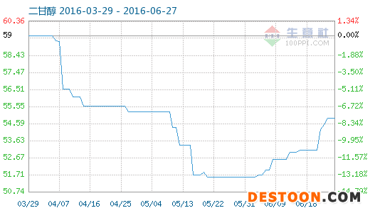 6月27日二甘醇商品指數(shù)為56.00,較昨日上升了1.1點(diǎn),較周期內(nèi)最高點(diǎn)115.40點(diǎn)(2014-06-17)下降了51.47%,較2015年12月14日最低點(diǎn)45.67點(diǎn)上漲了22.62%。(注:周期指2014-03-01至今)