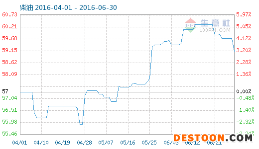 6月29日柴油商品指數(shù)為59.13,較昨日下降了0.56點(diǎn),較周期內(nèi)最高點(diǎn)109.93點(diǎn)(2012-03-30)下降了46.21%,較2016年04月27日最低點(diǎn)55.90點(diǎn)上漲了5.78%。(注:周期指2011-09-01至今)