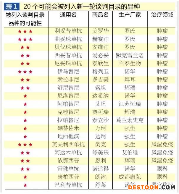 通過以上篩選,目前有超過20個(gè)品種可能會(huì)被列入新一輪的談判目錄,這其中大多數(shù)品種屬于癌癥用藥,其他一些品種主要針對(duì)風(fēng)濕免疫、失明和器官移植排異等嚴(yán)重疾病。(見表1,“★”星級(jí)代表短期被列入談判目錄品種的可能)