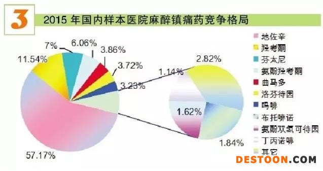 HDM系統(tǒng)數(shù)據(jù)顯示,2015年,國內(nèi)16個重點城市公立醫(yī)院麻醉鎮(zhèn)痛藥市場TOP 10藥物用藥金額為11.25億元,占據(jù)全部麻醉鎮(zhèn)痛藥市場的97%,顯示出極高的市場集中度。其中,居第一位的地佐辛占據(jù)57.17%,第二位的羥考酮占據(jù)11.54%,第三位的芬太尼占據(jù)7%,第四位的氨酚羥考酮占據(jù)6.06%,第五位的曲馬多占據(jù)3.86%;洛芬待因、嗎啡、布托啡諾、氨酚雙氫可待因、丁丙諾啡等則占據(jù)14.37%。