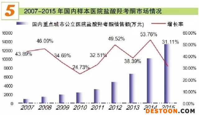 據(jù)HDM系統(tǒng)數(shù)據(jù),2015年國內(nèi)重點城市公立醫(yī)院地佐辛用藥金額為6.62億元,同比上一年的5.21億元增長了27.10%。地佐辛是外科、婦產(chǎn)科使用較多的麻醉鎮(zhèn)痛藥物,隨著該藥銷售額的增長,增長率曲線呈逐年放緩態(tài)勢。