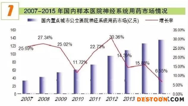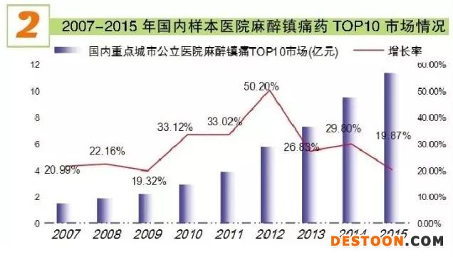 據(jù)米內(nèi)網(wǎng)HDM系統(tǒng)數(shù)據(jù),2015年國內(nèi)重點城市公立醫(yī)院神經(jīng)系統(tǒng)用藥市場規(guī)模為134.13億元,同比上一年增長了6.55%;其中,麻醉鎮(zhèn)痛藥市場有29個藥物,用藥金額為11.58億元,同比上一年增長了18.89%,遠(yuǎn)高于神經(jīng)系統(tǒng)用藥市場增長率,成為近年快速增長的品類。