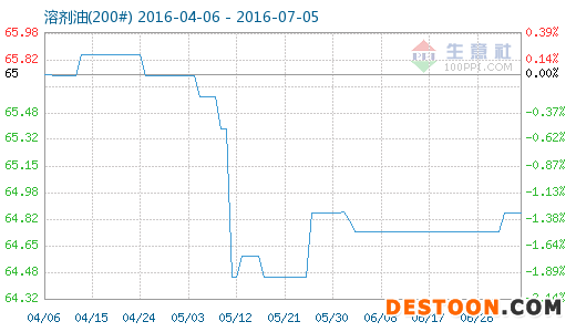 7月5日溶劑油(200#)商品指數(shù)為64.86,與昨日持平,較周期內(nèi)最高點(diǎn)103.41點(diǎn)(2012-09-23)下降了37.28%,較2016年05月25日最低點(diǎn)64.46點(diǎn)上漲了0.62%。(注:周期指2012-09-01至今)