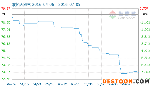 7月5日液化天然氣商品指數(shù)為73.30,較昨日上升了0.06點(diǎn),較周期內(nèi)最高點(diǎn)130.44點(diǎn)(2013-12-15)下降了43.81%,較2016年06月26日最低點(diǎn)73.16點(diǎn)上漲了0.19%。(注:周期指2012-09-01至今)