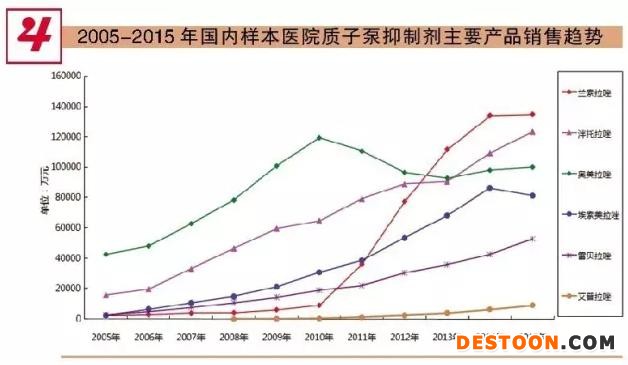 國(guó)內(nèi)PPI市場(chǎng)上主要產(chǎn)品有:蘭索拉唑、泮托拉唑、奧美拉唑、埃索美拉唑、雷貝拉唑、艾普拉唑。2005年國(guó)內(nèi)樣本醫(yī)院市場(chǎng)PPI銷售額為6.6億元,2009年銷售額過20億元,2015年銷售額已高達(dá)50億元。在患者增多以及消化性潰瘍轉(zhuǎn)變成慢性疾病需長(zhǎng)期服藥這兩種因素的推動(dòng)下,質(zhì)子泵抑制劑以其良好的品質(zhì)和優(yōu)秀的療效贏得了市場(chǎng)認(rèn)同,該類產(chǎn)品在抗酸類藥物醫(yī)院終端市場(chǎng)占據(jù)絕對(duì)優(yōu)勢(shì),市場(chǎng)保持了較快的增長(zhǎng)速度。