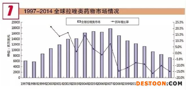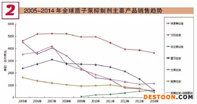 蘭索拉唑是由日本武田公司開發(fā)的第二代質(zhì)子泵抑制劑。該藥1997-2005年市場(chǎng)上升較快,但2006-2014年則快速下降。2003年,其銷售額超過奧美拉唑,達(dá)到46.6億美元,在全球拉唑類藥物中排名第一位,2007開始市場(chǎng)快速下降。