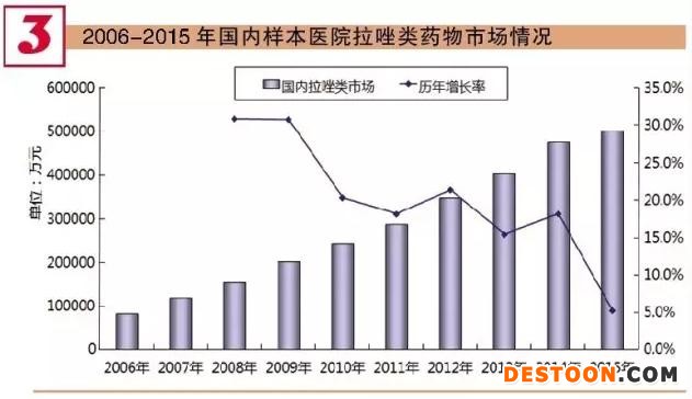 蘭索拉唑是第二代質(zhì)子泵抑制劑,主要?jiǎng)┬陀蟹坩槃?、片劑和膠囊劑。2008年,江蘇奧賽康藥業(yè)開發(fā)注射用蘭索拉唑粉針劑后,國(guó)內(nèi)相繼有12家企業(yè)獲得粉針劑生產(chǎn)批件。新劑型的上市大大激發(fā)了市場(chǎng)潛力。從2005-2015年整體銷售趨勢(shì)來看,該產(chǎn)品增勢(shì)強(qiáng)勁。2005年,樣本醫(yī)院蘭索拉唑用藥金額為2526萬元;2015年,用藥金額達(dá)13.5億元;近10年增長(zhǎng)近53.3倍,其復(fù)合增長(zhǎng)率為48.8%。特別是2009年蘭索拉唑進(jìn)入國(guó)家醫(yī)保目錄后,極大激發(fā)了市場(chǎng)份額的快速增長(zhǎng)。