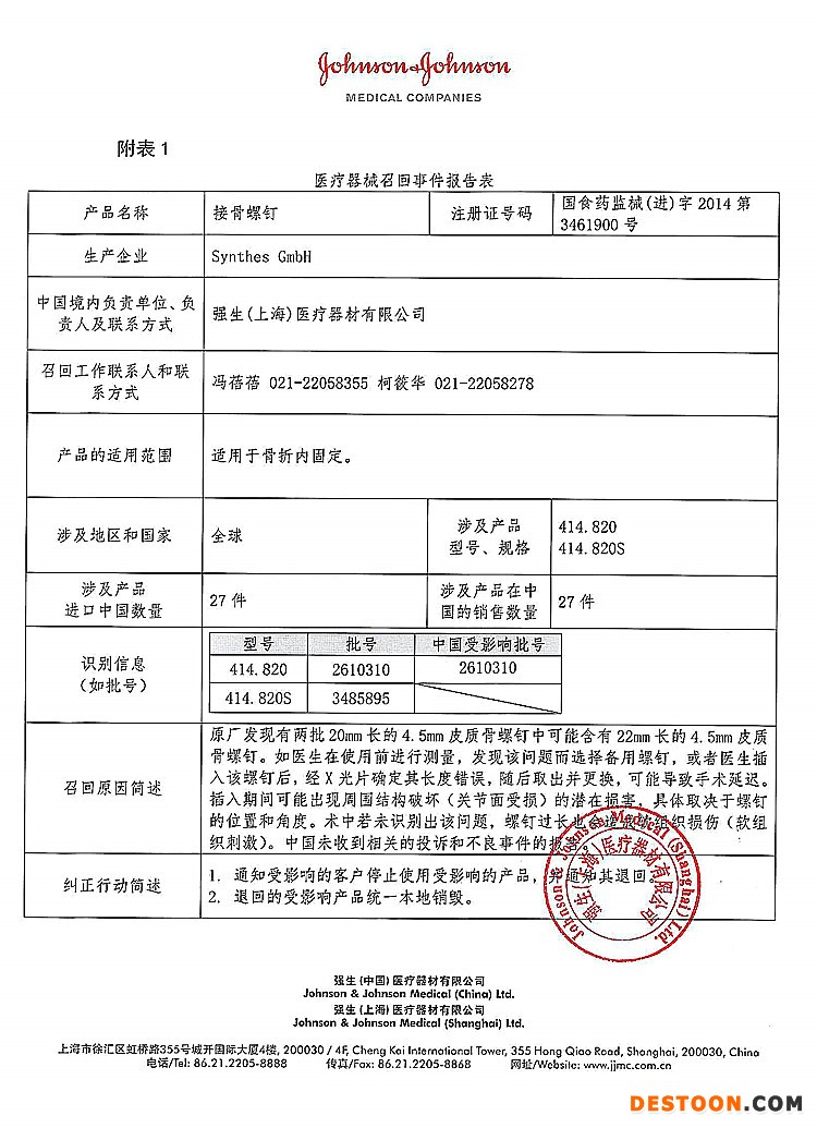 5、強生(上海)醫(yī)療器材有限公司對接骨螺釘主動召回