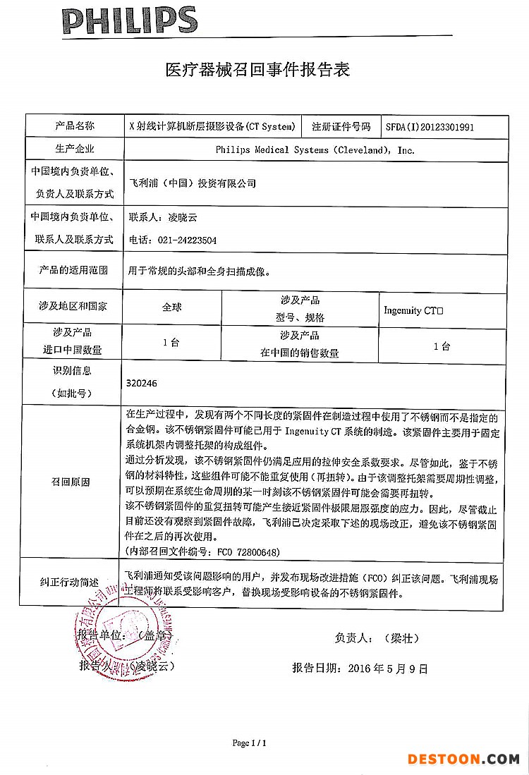 10、飛利浦(中國)投資有限公司對X射線計算機斷層攝影設(shè)備主動召回