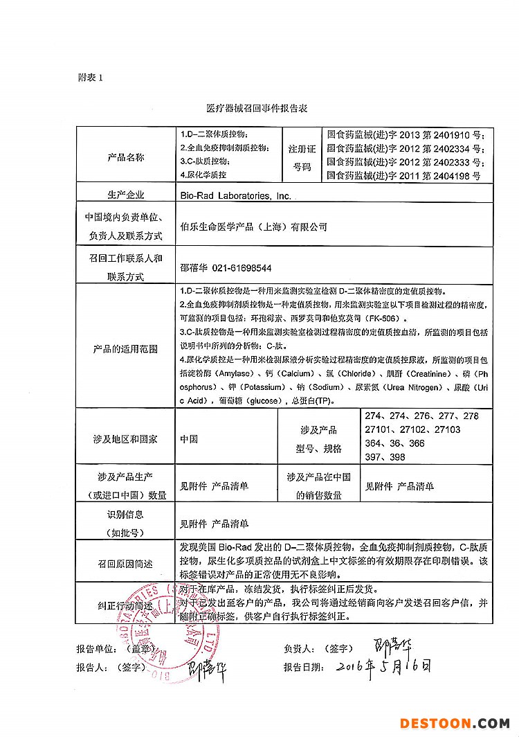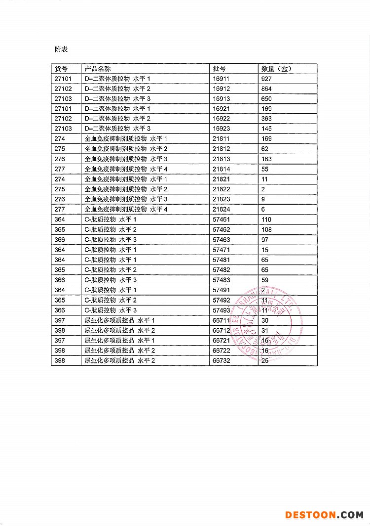12、伯樂生命醫(yī)學(xué)產(chǎn)品(上海)有限公司對D-二聚體質(zhì)控物、全血免疫抑制劑質(zhì)控物、C-肽質(zhì)控物、尿化學(xué)質(zhì)控主動召回