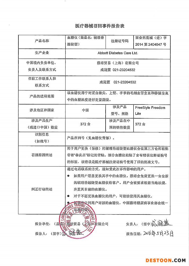 雅培貿(mào)易(上海)有限公司報告:企業(yè)發(fā)現(xiàn),部分血糖儀粘貼了含有錯誤注冊證編號的標簽,該錯誤是醫(yī)療器械注冊證編號使用了舊的批準文號。公司決定召回相關(guān)產(chǎn)品,本次召回級別III級,涉及產(chǎn)品的型號、規(guī)格及批次等詳細信息見《醫(yī)療器械召回事件報告表》。