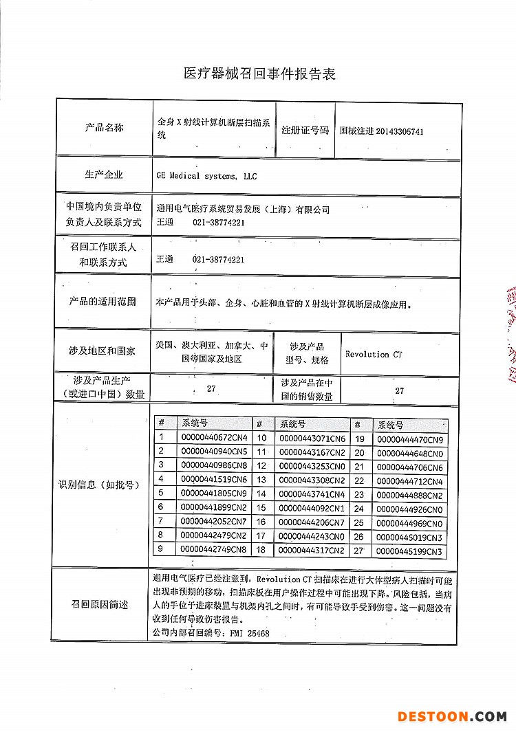 通用電氣醫(yī)療系統(tǒng)貿(mào)易發(fā)展(上海)有限公司報告:企業(yè)發(fā)現(xiàn),Revolution CT掃描床在進行大體型病人掃描時可能出現(xiàn)非預(yù)期的移動,掃描床板在用戶操作過程中可能出現(xiàn)下降,有可能導(dǎo)致傷害。公司決定召回相關(guān)產(chǎn)品,本次召回級別II級,涉及產(chǎn)品的型號、規(guī)格及批次等詳細信息見《醫(yī)療器械召回事件報告表》。