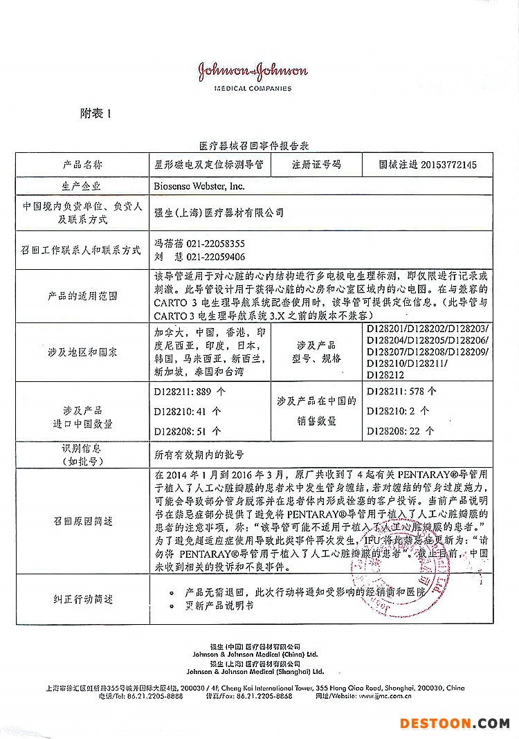 4、強生(上海)醫(yī)療器材有限公司對星形磁電雙定位標測導(dǎo)管主動召回