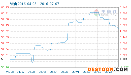 7月7日柴油商品指數(shù)為58.89,與昨日持平,較周期內(nèi)最高點(diǎn)109.93點(diǎn)(2012-03-30)下降了46.43%,較2016年04月27日最低點(diǎn)55.90點(diǎn)上漲了5.35%。(注:周期指2011-09-01至今)