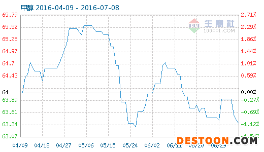 7月7日甲醇商品指數(shù)為63.37,較昨日下降了0.07點(diǎn),較周期內(nèi)最高點(diǎn)127.32點(diǎn)(2013-12-11)下降了50.23%,較2016年01月21日最低點(diǎn)57.93點(diǎn)上漲了9.39%。(注:周期指2011-09-01至今)