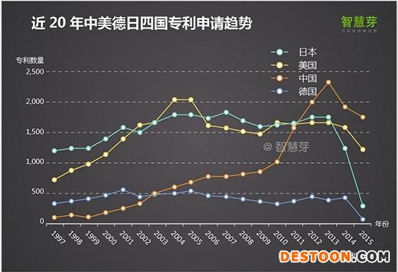 3.近20年中美日德四國的專利申請趨勢(圖表最好改大一點,并把幾個國家代碼改為國家名稱。如:jp-日本,us-美國,cn-中國,de-德國)