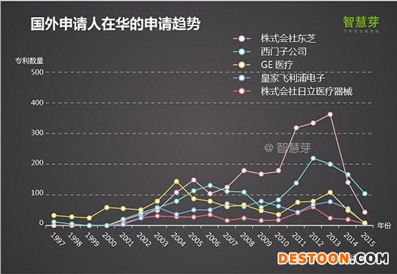從全球主要申請人來看,排在前五的公司所擁有的專利總量為4萬多件,占全球?qū)@偭康?0%。東芝公司,GE公司,西門子公司,飛利浦公司,日立公司這幾家影像醫(yī)學(xué)設(shè)備的巨頭,不僅在全球影像產(chǎn)品的市場份額上遙遙領(lǐng)先,在專利技術(shù)的儲備和技術(shù)壁壘的構(gòu)建上,也保持著同步,讓其他競爭對手望塵莫及。