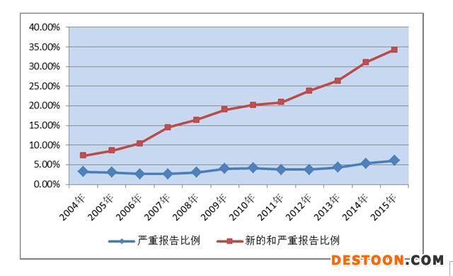 圖2 2004年-2015 年新的和嚴重以及嚴重藥品不良反應(yīng)/事件報告比例