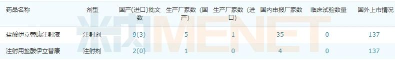 伊立替康注射劑適用于晚期大腸癌患者的治療,米內(nèi)網(wǎng)數(shù)據(jù)顯示,2019年在中國(guó)公立醫(yī)院、縣級(jí)公立醫(yī)院、城市社區(qū)中心及鄉(xiāng)鎮(zhèn)衛(wèi)生院(簡(jiǎn)稱中國(guó)公立醫(yī)療機(jī)構(gòu))終端伊立替康的銷售額達(dá)18億元,目前已上市的產(chǎn)品包括了,鹽酸伊立替康注射液、注射用伊立替康,其中鹽酸伊立替康注射液的競(jìng)爭(zhēng)企業(yè)有6家。