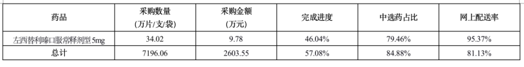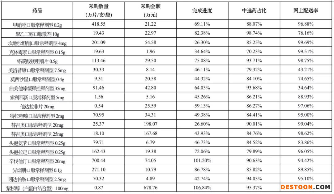 此外,阿卡波糖50mg(66.62%)、阿莫西林0.25g(64.92%)、安立生坦片5mg(92.86%)、對乙酰氨基酚0.5g(60.31%)、甲硝唑0.2g(69.11%)、聚乙二醇口服散劑10g(82.38%)、鋁碳酸鎂咀嚼片0.5g(75.08%)、曲美他嗪緩釋控釋劑型35mg(64.03%)、頭孢拉定0.25g(72.06%)、異煙肼0.1g(86.78%)、他達拉非片20mg(59.13%)共11個品規(guī)的完成進度大于50%。