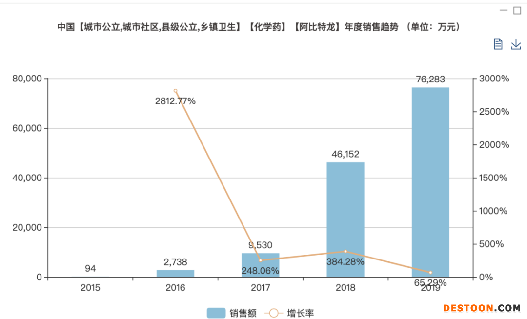 比如此次兩個月內超額7倍完成的阿比特龍、賽柏藍在米內網數(shù)據庫查詢,該品種2019年在全國公立醫(yī)院終端的銷售市場達到7.62億。