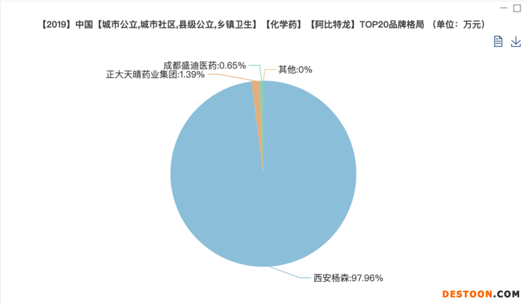 在阿比特龍TOP20品牌格局中,西安楊森占據97.96%的絕對市場份額,剩余2.04%的品種為正大天晴和成都盛迪醫(yī)藥所瓜分,前者占據1.39%,后者占據0.65%。