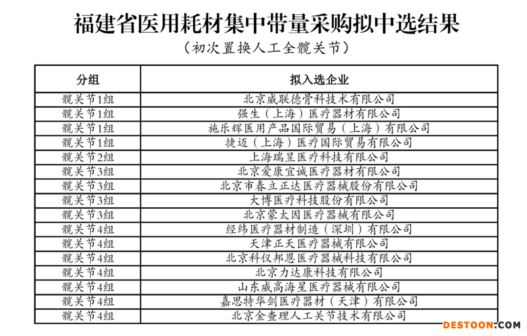 初次置換人工全髖關(guān)節(jié)擬中選企業(yè)包括強(qiáng)生、施樂輝、捷邁、山東威高等械企;