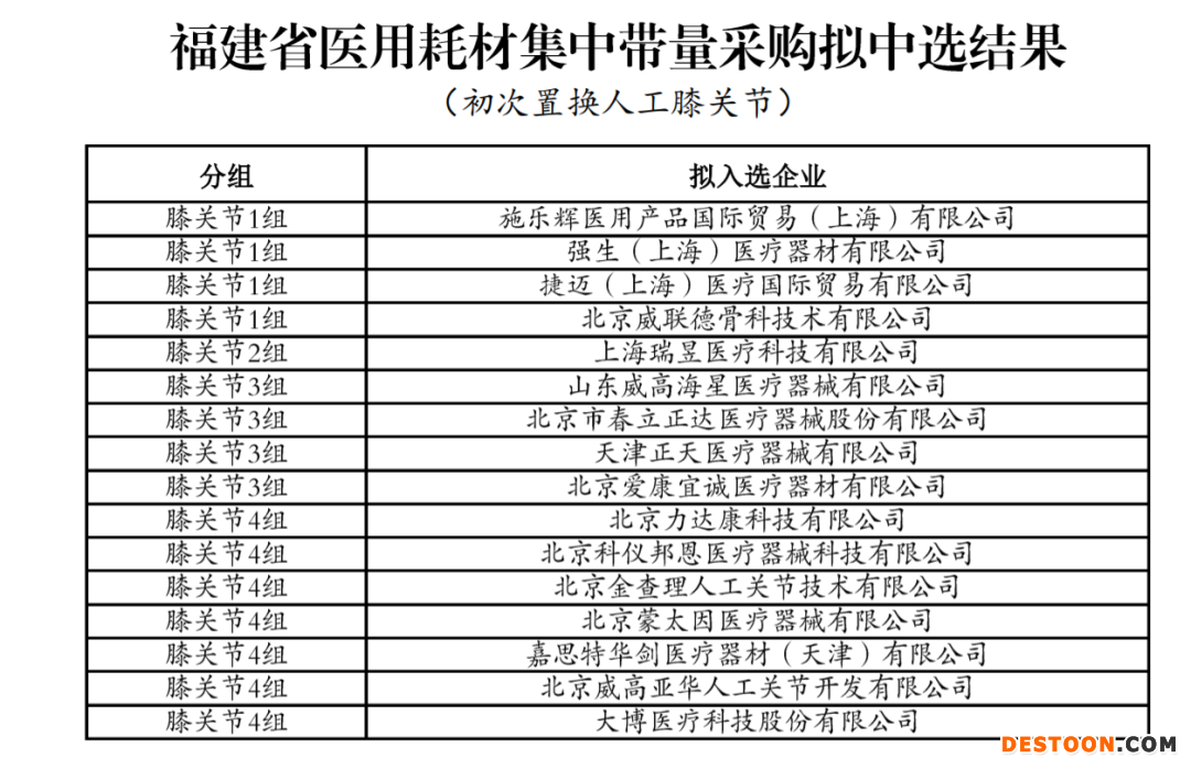 初次置換人工膝關(guān)節(jié)擬中選企業(yè)包括強(qiáng)生、捷邁、施樂輝、山東威高、大博醫(yī)療等械企;