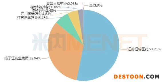 值得一提的是,2018年6月?lián)P子江的鹽酸右美托咪定注射液以3類仿制獲批上市,并視同過評,隨后獨(dú)家中標(biāo)“4+7”集采、聯(lián)盟地區(qū)集采,市場份額快速攀升,2018年不足1%,2019年則暴增超過180倍,市場份額突破30%,僅次于恒瑞醫(yī)藥。