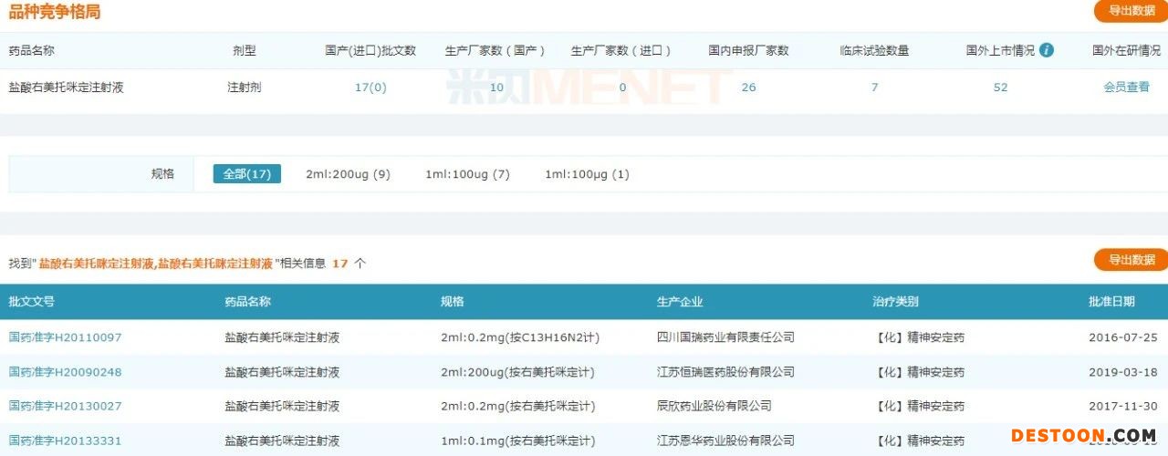 日前,CDE官網(wǎng)顯示,江蘇正大清江制藥的鹽酸右美托咪定注射液以仿制3類申報(bào)上市。米內(nèi)網(wǎng)數(shù)據(jù)顯示,2019年中國公立醫(yī)療機(jī)構(gòu)終端右美托咪定注射劑銷售額超過30億元。目前,國內(nèi)生產(chǎn)企業(yè)有恒瑞醫(yī)藥、揚(yáng)子江藥業(yè)、辰欣藥業(yè)、恩華藥業(yè)、湖南科倫制藥等10家。一致性評價方面,僅有揚(yáng)子江藥業(yè)一家過評。