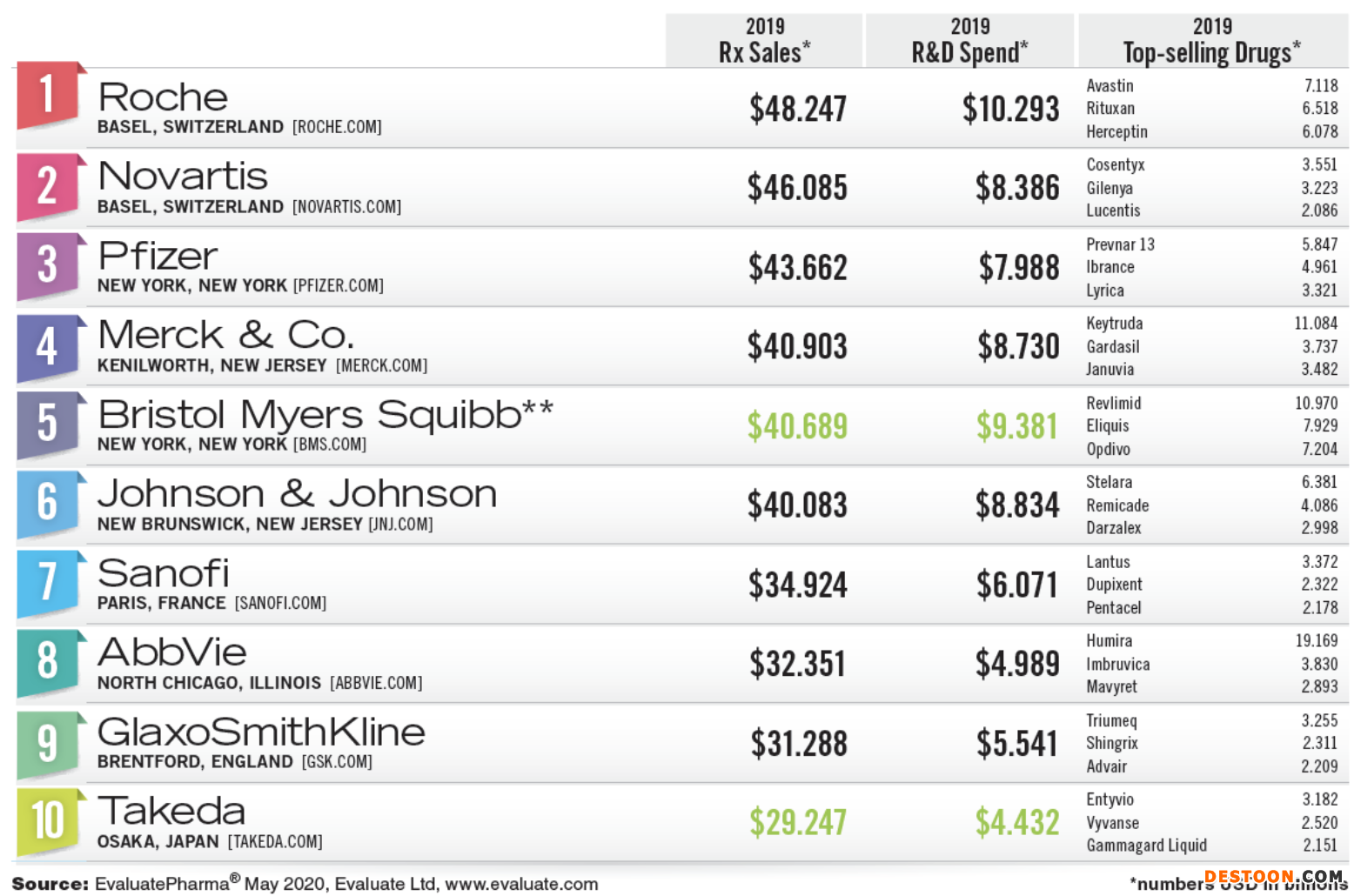 盡管艾伯維(排名第8)最終于上個月完成了以620億美元收購艾爾建(排名18)的收購交易,但二者還未合并計(jì)算,主要是新冠肺炎的大流行拖延了這一重要并購案的進(jìn)度。因此在未來1-2年內(nèi),艾伯維的全球排名可能迅速提升至前五名。