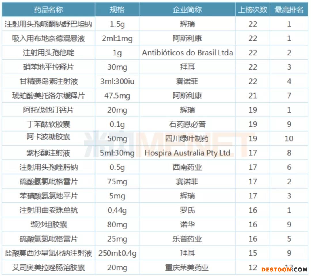 其中,輝瑞的阿托伐他汀、賽諾菲的硫酸氫氯吡格雷、輝瑞的苯磺酸氨氯地平和樂普的硫酸氫氯吡格雷片均榜上有名,且均上榜17次以上,最高排名基本都在前三名。